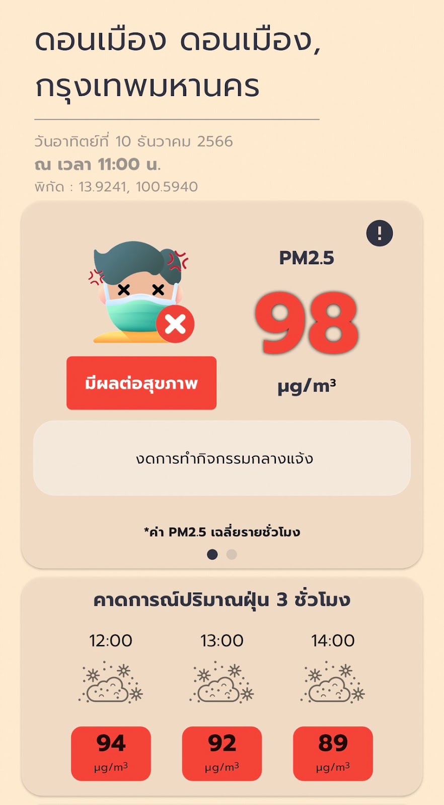 😷ประชาชนควรสวมหน้ากากตลอดเวลาเมื่ออยู่ในที่โล่งแจ้ง เพื่อป้องกันผลกระทบที่อาจตามมาโดยเฉพาะโรคเกี่ยวกับระบบทางเดินหายใจ ทั้งนี้ ท่านสามารถติดตามข้อมูล PM2.5 เพิ่มเติมผ่านแอปพลิเคชัน "เช็คฝุ่น"